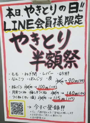 「LINE会員様限定 本日焼き鳥半額祭り!」開催です。