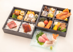 ローストビーフ、うなぎ、角煮、季節野菜の煮物など見た目も美味しいお刺身付きの豪華御膳